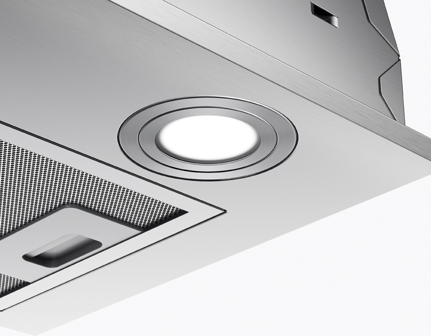 Завдяки продуманому дизайнерському та касетному алюмінієвому фільтрі, капюшони ефективно усувають пар і запахи, не вимагаючи складного обслуговування. І високий показник вільного виходу повітря (736 м³/год) гарантує чисте повітря навіть при інтенсивному приготуванні.