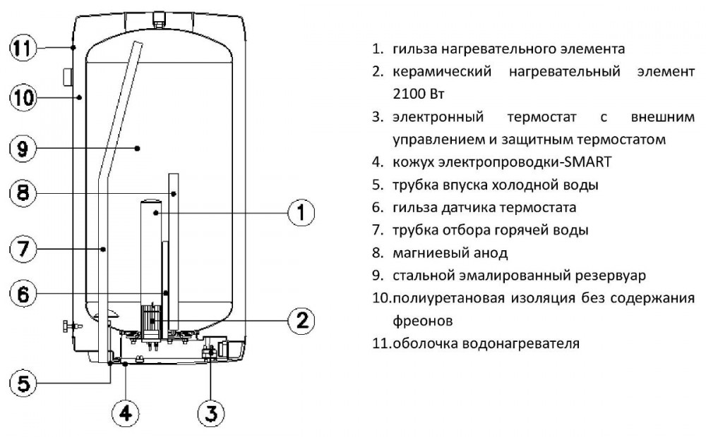 Внутрішня поверхня бака покрита високоякісної емаллю без вмісту нікелю, що в поєднанні із захисним магнієвим анодом забезпечує довговічність роботи водонагрівача.