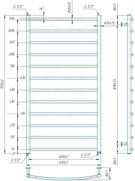 Водяна сушка для рушників Mario Inox Класик 1170х630/600 нержавіюча сталь хром 4820258986927