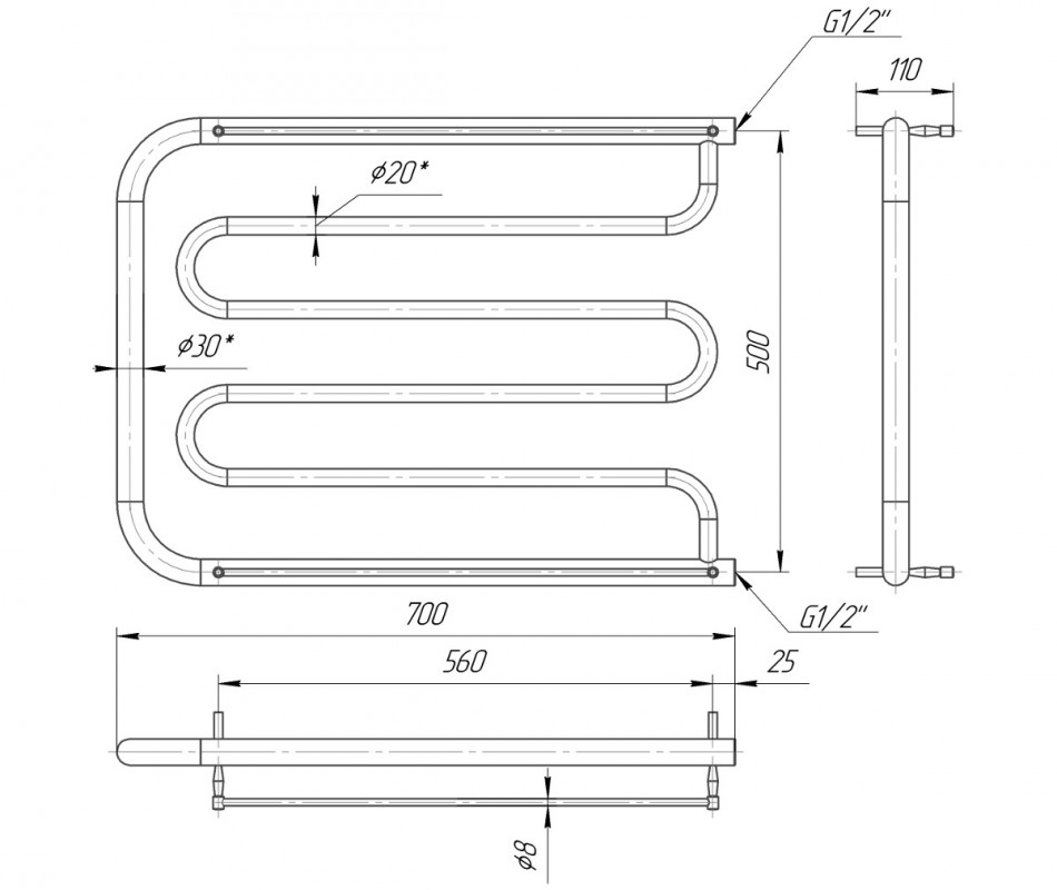 Водяний полотенцесушитель Mario Фокстрот 530x700 / 500 мм