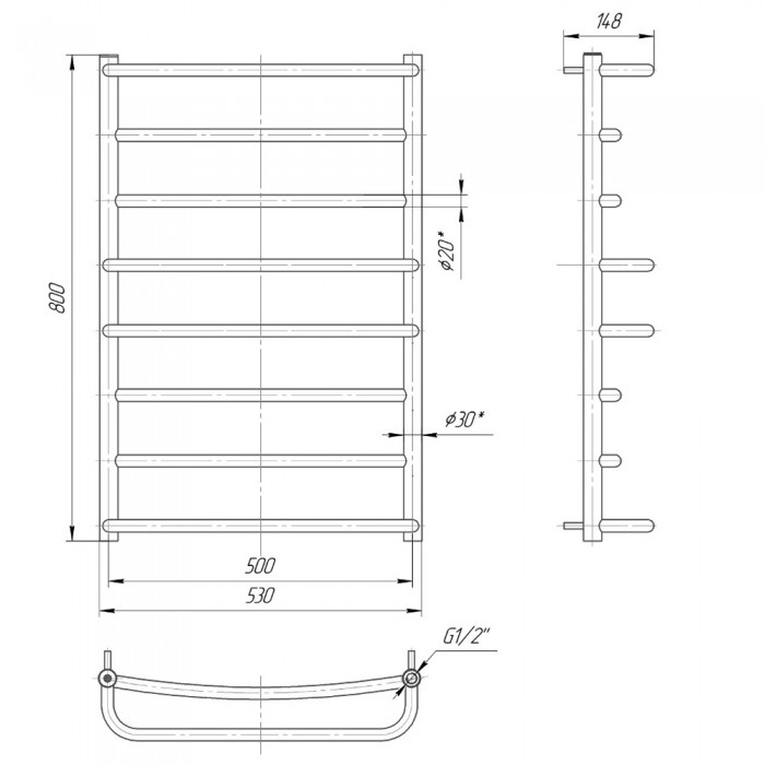 Гармонійний дует надійності і практичності прекрасно втілений в даній моделі водяного полотенцесушителя Люкс 800x530 / 500, де 800 мм - висота, 530 мм - ширина, а 500 мм - міжцентрову відстань. Бездоганна якість і довічнагарантія засновані не тільки на двадцятирічному досвіді компанії-виробника на ринку, але і на використанні у виробництві європейської нержавіючої сталі марки AISI 304. Дана модель має в своїй конструкції 8 перемичок, з яких 4 виступаючі перемички П-подібної форми для більш практичного застосування рушникосушки. У разі підбору трубчастого електронагрівача до виробу Люкс 800x530 / 500 компанія-виробник «Маріо» рекомендує для підбору електричний ТЕН потужністю 120 W.