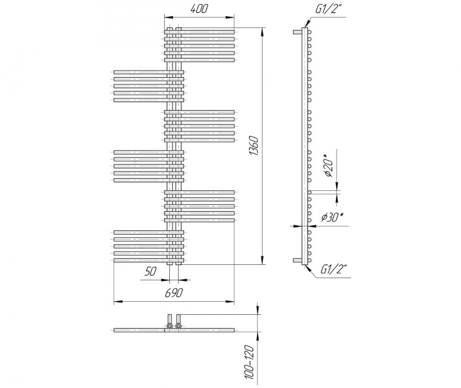 водяний полотенцесушитель Преміум Симфонія 1360x690 з міжосьовим відстанню для підключення 50мм, диметр підключення G 1/2 '' складається з 30 ребер. Полотенцесушитель Преміум Симфонія проізводсветнного підприємства Mario виготовлений з нержавіючої сталі АІSI 304 може бути обладнаний електричним теном. Span>