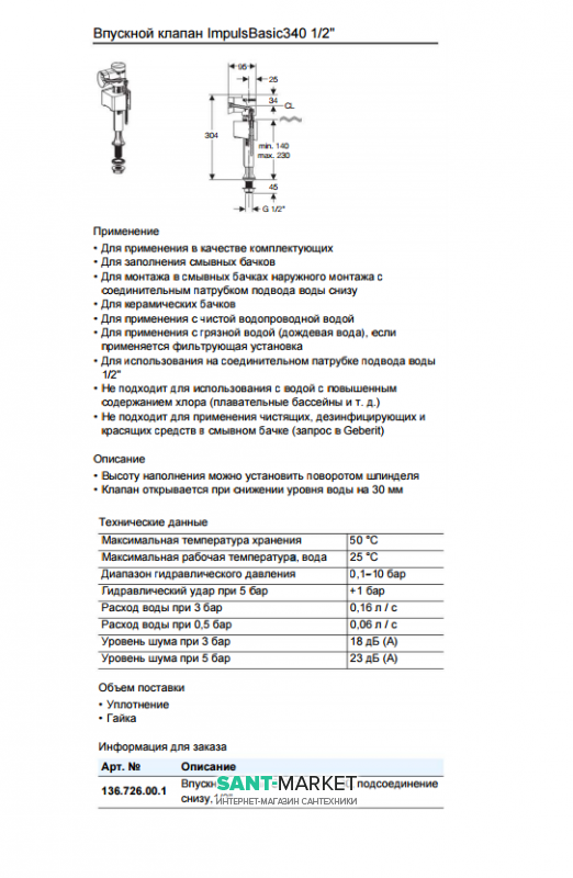 Впускний клапан Geberit ImpulsBasic340 підведення води знизу 136.752.00.1