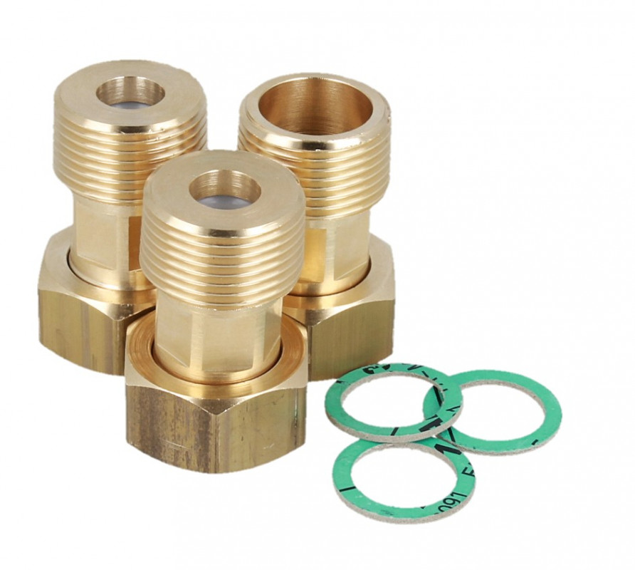 Комплект з'єднань і прокладок внутрішня 3/4" x зовнішня 3/4". З'єднувальний набір призначений для використання вяк з'єднувальний елемент для триходових змішувальних клапанів із зовнішньою різьбою 3/4". Набір забезпечує швидкий монтаж і демонтаж змішувального клапана з установки для очищення, обслуговування або заміни Додатково гвинтові з'єднання із запірними клапанами, розташованими на вхідних з'єднаннях, запобігають зворотному потіку у разі падіння тиску на одному з з'єднань.