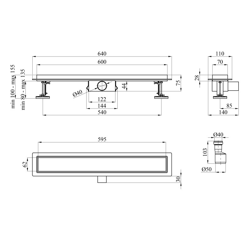 Жолоб Kroner KRP Eifel-F60Fliese з решіткою 600 мм нержавіюча сталь