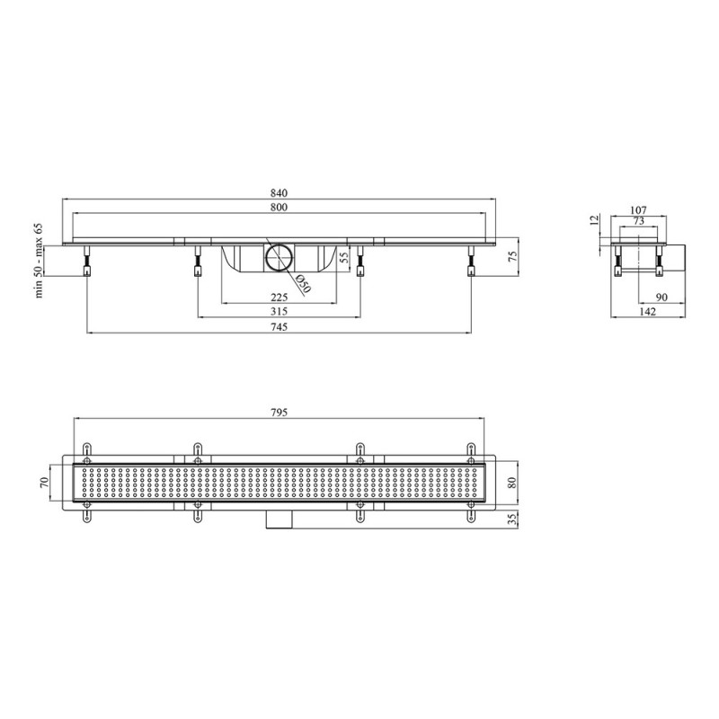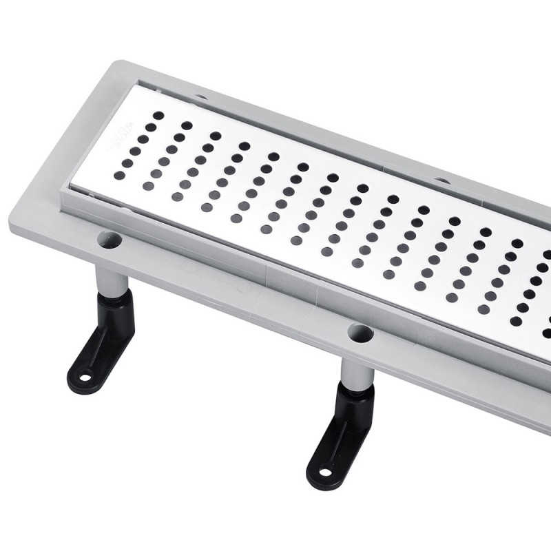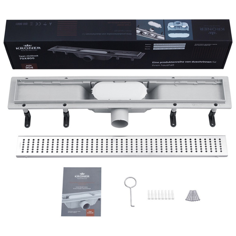 Слив лінійний Kroner KRP Harz L80 Löcher з декоративною решіткою розміром 800х73 мм з нержавіючої сталі виконує функцію дренажу з душових кабін без використаннядушовий піддон врівень з підлогою. Корпус драбини виготовлений з міцного пластику, стійкого до агресивних середовищ. Душовий злив також має сухий гідрозатвор діаметром 50 мм, який надійно захистить від проникнення неприємних запахів з каналізаційних труб. Конструкція лотка дозволяє чистити виріб без зайвих труднощів.