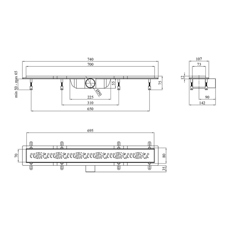 Слив лінійний Kroner KRP Harz M70 Musterз декоративною решіткою розміром 700х73 мм з нержавіючої сталі виконує функцію водовідведення з душових кабін без використання душу.піддон врівень з підлогою. Корпус драбини виготовлений з міцного пластику, стійкого до агресивних середовищ. Душовий злив також має сухий гідрозатвор діаметром 50 мм, який надійно захистить від проникнення неприємних запахів з каналізаційних труб. Конструкція лотка дозволяє чистити виріб без зайвих труднощів.