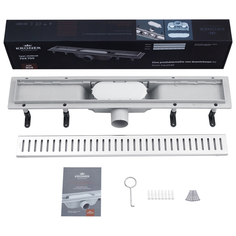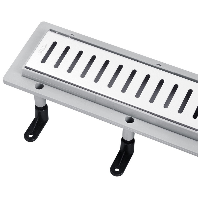Слив лінійний Kroner KRP Harz S70 Sektionз декоративною решіткою розміром 700х73 мм з нержавіючої сталі виконує функцію водовідведення з душових кабін без використання душу.піддон врівень з підлогою. Корпус драбини виготовлений з міцного пластику, стійкого до агресивних середовищ. Душовий злив також має сухий гідрозатвор діаметром 50 мм, який надійно захистить від проникнення неприємних запахів з каналізаційних труб. Конструкція лотка дозволяє чистити виріб без зайвих труднощів.