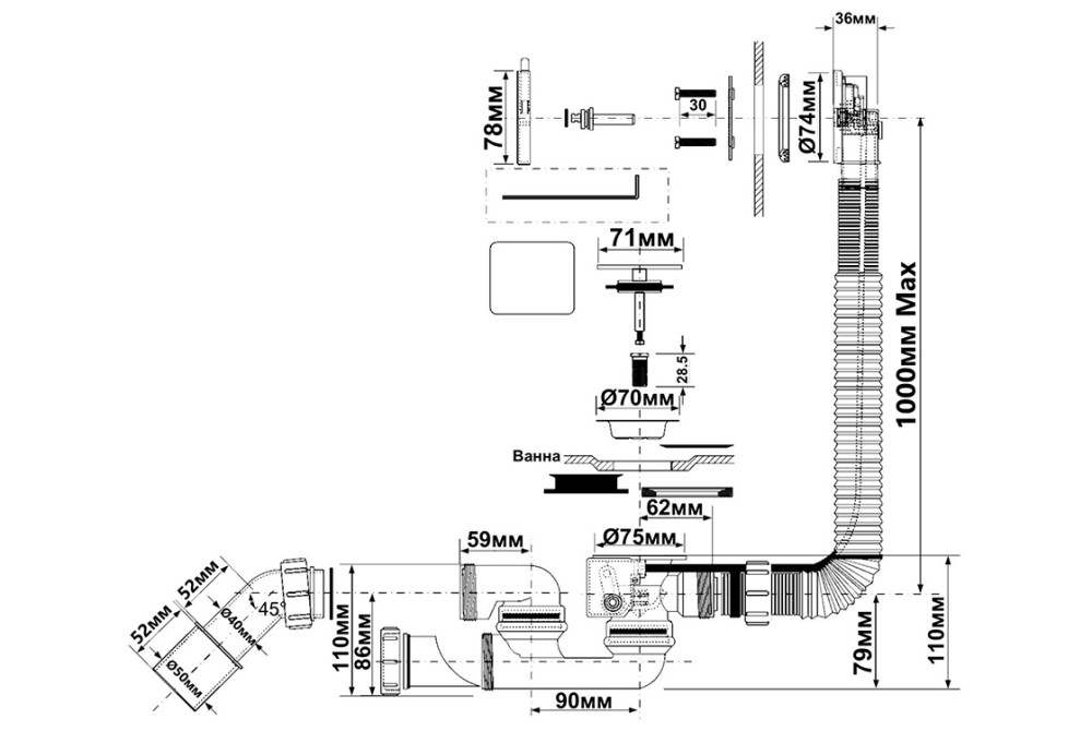дренаж для ванни МакАлпін. Автоматизувати квадратний хром