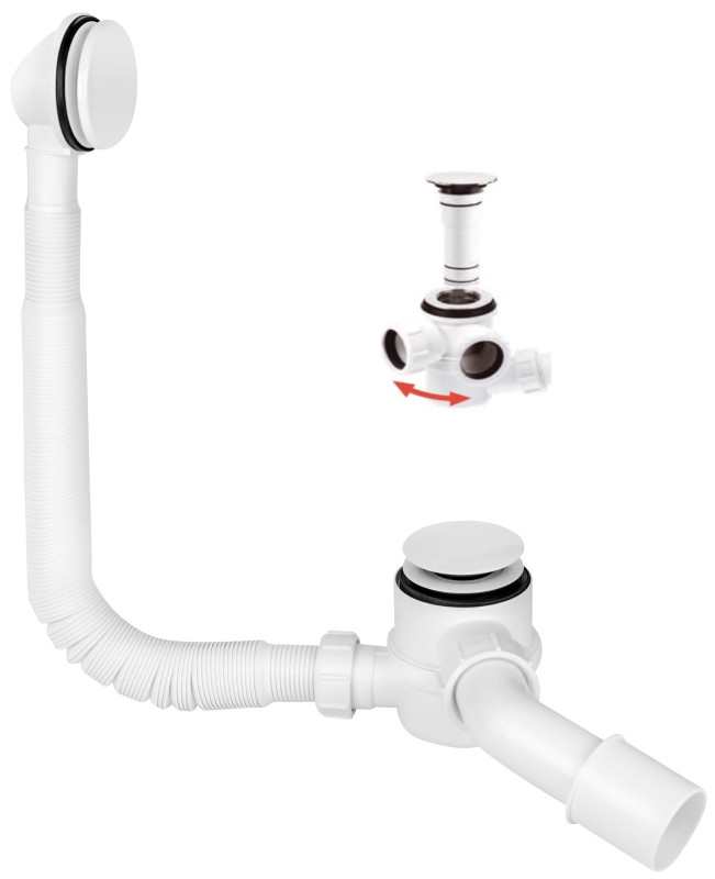 пляшка сифон для ванної або глибокого лотка для душу, з переливанням розтягування . Вода з ванни виготовляється натисканням кнопки злив. Очищення сифона - зверху, що дозволяє видалити бруд, не аналізуючи весь пристрій. У комплектіКлавіші входять для складання продукту, не пошкоджуючи пофарбовані частини. Сифон повертається до шарнірного з'єднання.