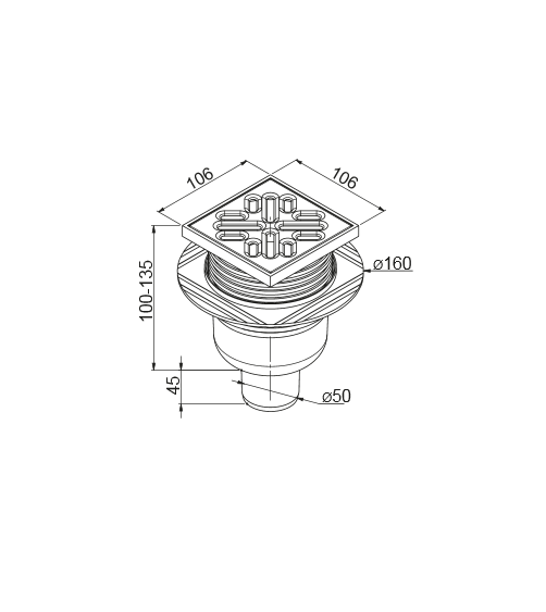 1) Зливний трап для душу Prevex зі сталевими гратами 106x106 мм