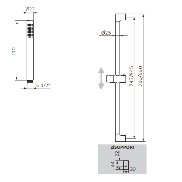 - душова стійка: розсувні L 790-990 мм, Ø 25 мм