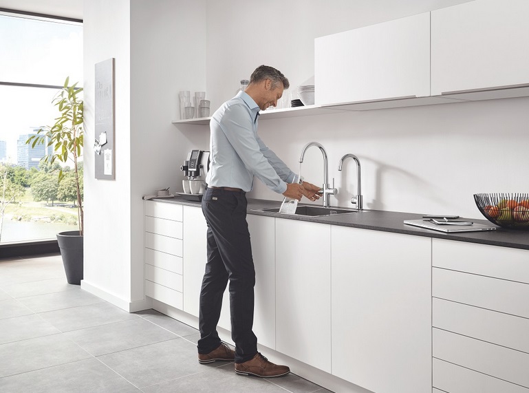 Ви можете вибратинегазовану, середню або газовану воду, на будь-який смак. У комплект входять змішувач GROHE Blue і охолоджувач, здатний подавати до 12 літрів охолодженої води в годину (цього досить для 40 користувачів). Змішувач відрізняється шикарним і зручним у використанні високим С-образним зливом з поворотом на 150 ° і тонким корпусом, а також регулятором напору, який можна натискати і повертати.