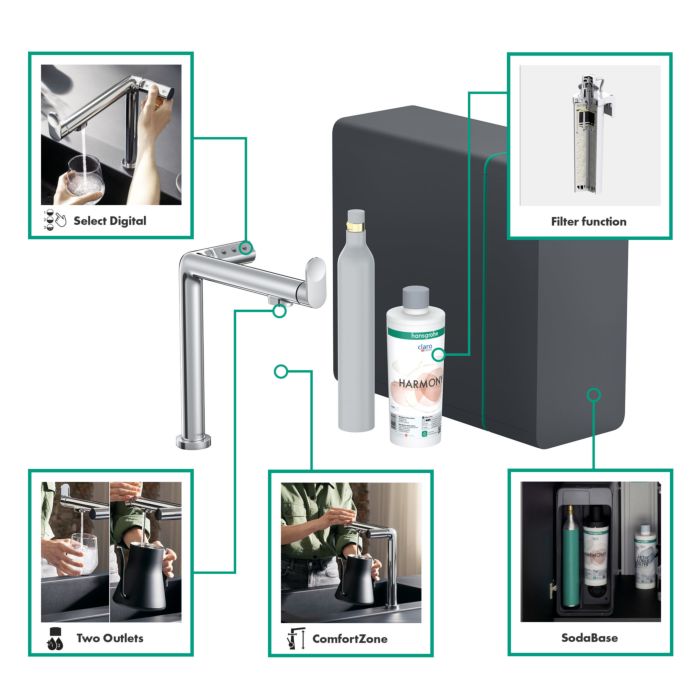 охолоджена, фільтрована питна вода в негазованому, середньому та газованому стані за допомогою кнопки Select на носику; управління та моніторинг даних про споживання через додаток hansgrohe home