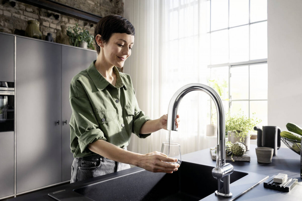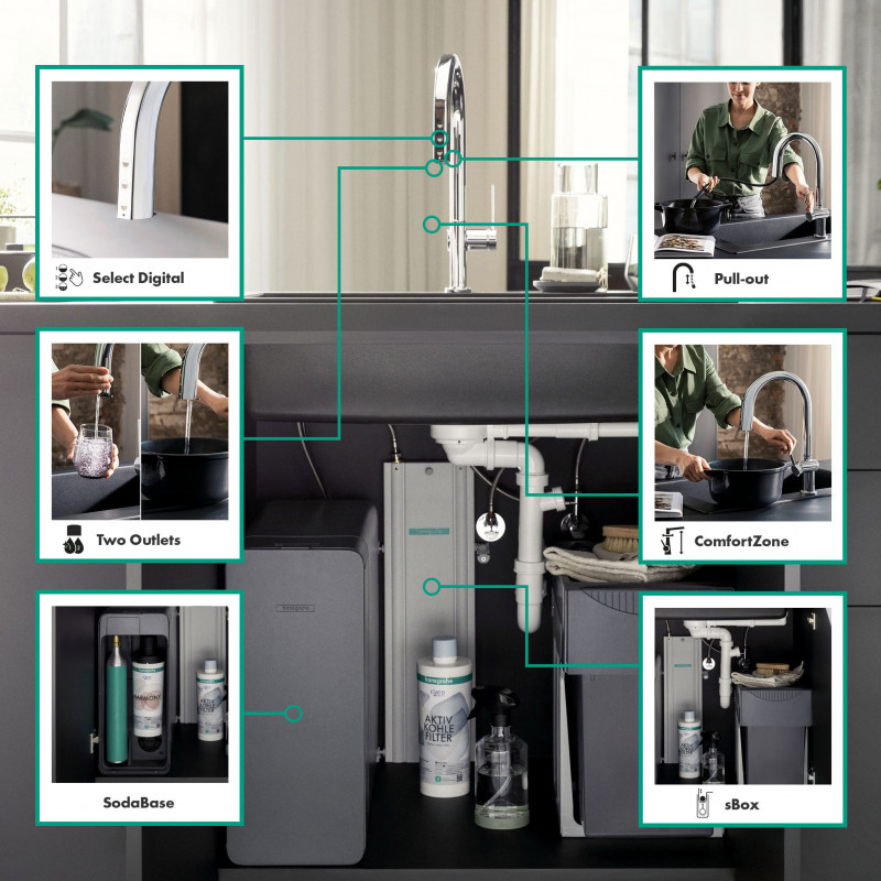 охолоджена, фільтрована питна вода в негазованому, середньому та газованому стані за допомогою кнопки Select на носику; управління та моніторинг даних про споживання через додаток hansgrohe home