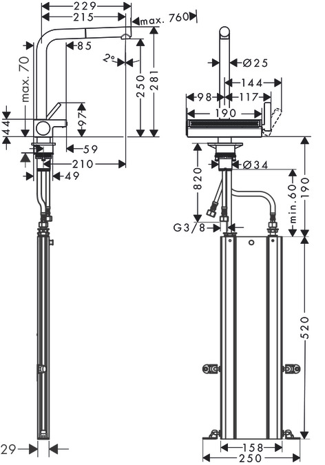 - кут повороту виливу: регулювання на 3 рівня на 60 °, 110 ° або 150 °