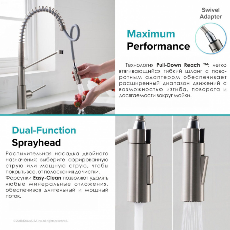 - Технологія Reach™ : Гнучкий шланг, що легко втягується, з поворотним адаптером забезпечує розширений діапазон руху, дозволяючи його згинати і повертати, щоб діставати до будь-якого місця навколо раковини.