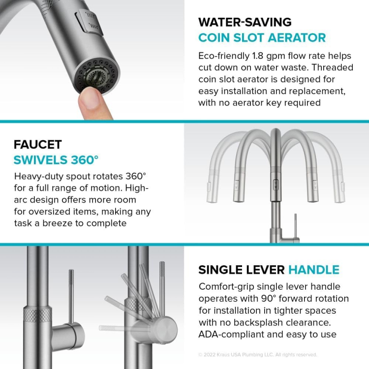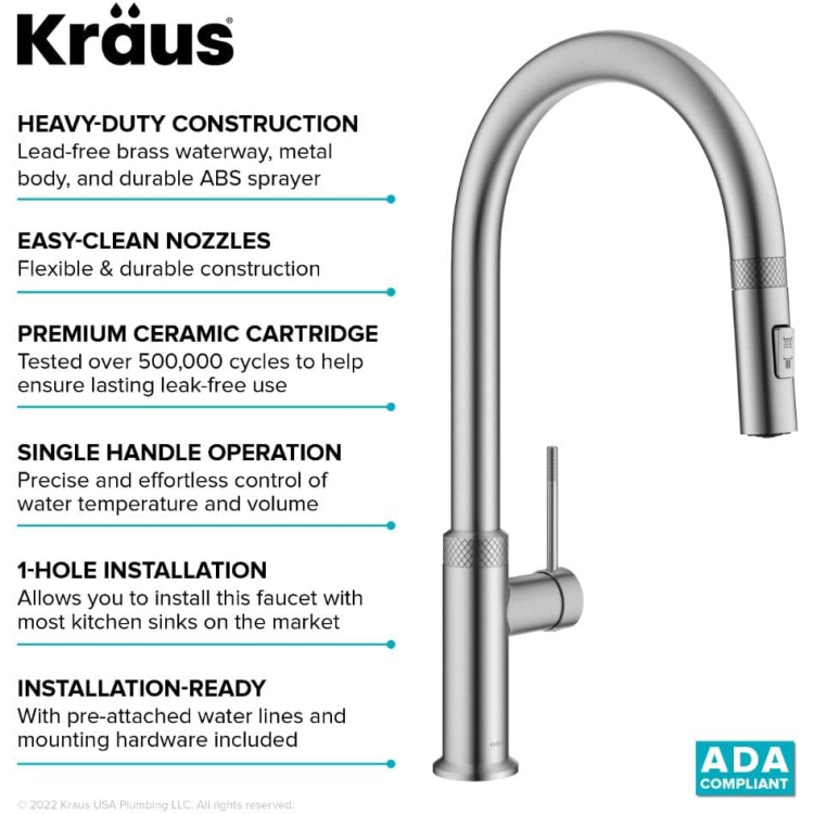 Естетична досконалість сантехніки Kraus поєднується з високою функціональністю та еталонним рівнем якості. Вся представлена в каталозі продукція відповідає стандартам США та Канади, а також пройшла міжнародну сертифікацію (CUPC, CSA, CRG, ANSI, IAPMO та ГТК). Високотехнологічне виробництво, ретельне тестування якості, талановита команда дизайнерів та інженерів – всі ці фактори дозволяють американській компанії створювати продукт,відповідає вимогам найвибагливіших споживачів. Сантехніка Краус – це статусне придбання, вишуканий елемент інтер'єру, зручність експлуатації та довговічність комплектуючих.