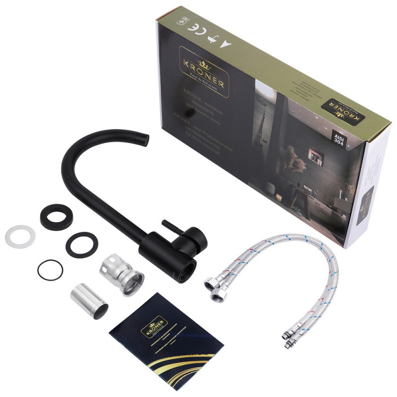 Кухонні змішувачі Kroner - це німецька якість, технологія та надійність. Сучасний дизайн стане вдалим доповненням інтер'єру кухні. Виготовлення зякісні матеріали, не схильні до корозії, простота збірки не завдасть клопоту при установці та експлуатації. Мають поворотний вихід і встановлюються на один отвір з подачею води за допомогою гнучких шлангів M10x1/2". Шланги для підключення входять в комплект. Дана модель виготовлена з нержавіючої сталі AISI 304.