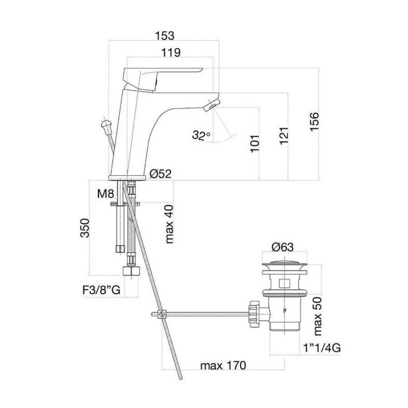 - У комплекті з гнучким підведенням, підведення - 350 мм, висота змішувача - 156 мм, довжина виливу - 119 мм.