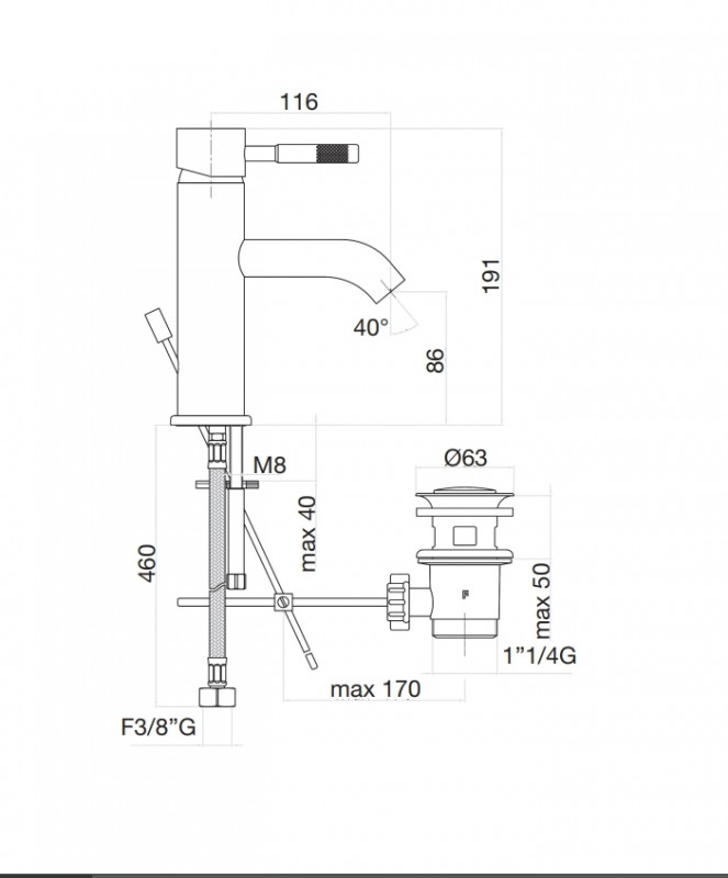 - Змішувач одноважільний з автоматичним донним клапаном 1"1/4 і гнучким підведенням 460 мм.