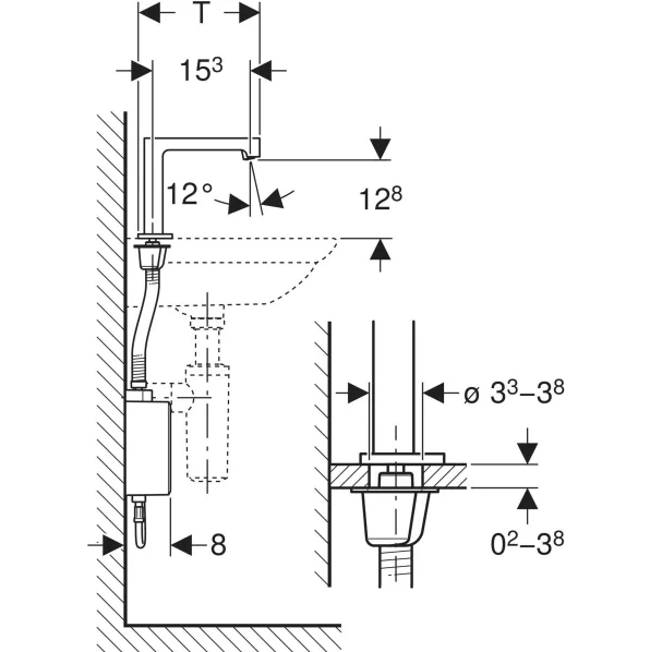- Модель без змішувача призначена для суміщення з проточним нагрівачем див. технічний паспорт «Змішувачі для умивальників із проточними нагрівачами»
