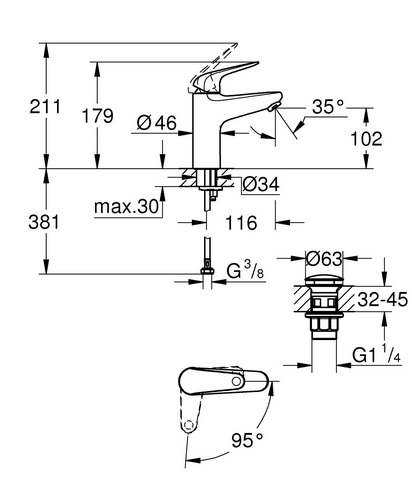 - Керамічний картридж з тривалого життя Grohe 28 мм з енергозберігаючою функцією (завдяки постачанню холодної води в центральному положенні ручки)