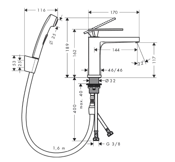 - одноважільний змішувач для умивальника 110 з ручним душем-біде та душовим шлангом 160 см