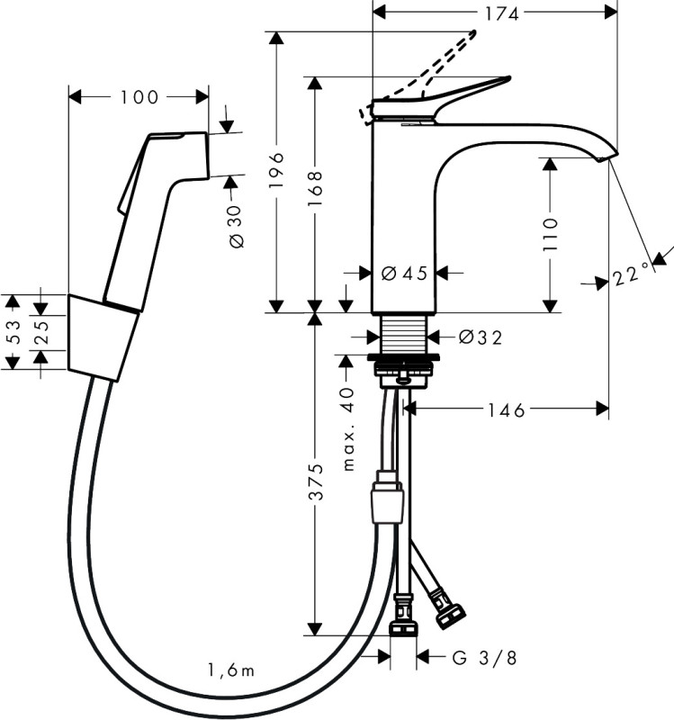 - складається з: одноважільного змішувача для раковини, ручного душу-біде, тримача для душу, душового шланга, зливного клапана