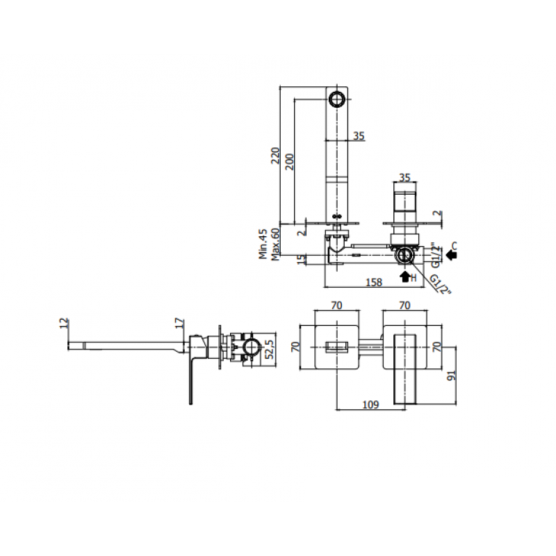 - Розмір врізного отвори: min. Ø 45 мм, max. Ø 60 мм
