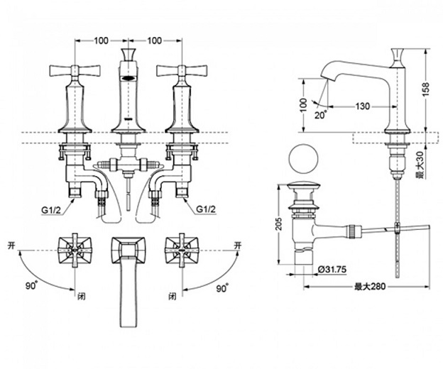 1) Змішувач для раковини TOTO Classic на 3 отвори двухвентильний хром