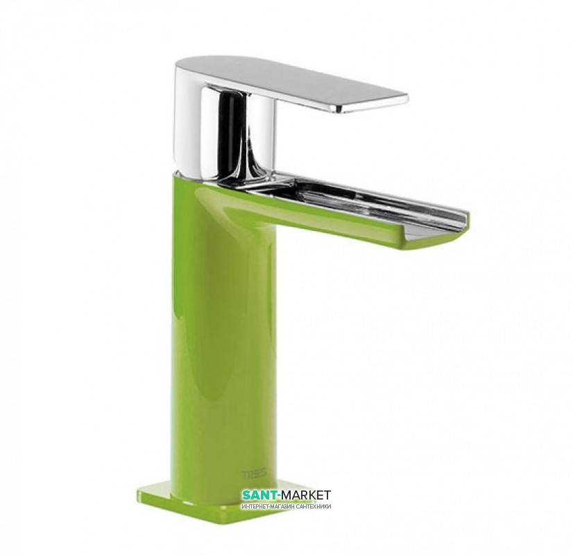 1) Змішувач для раковини Tres Loft colors змішувач з відкритим каскадним виливом зелений / хром