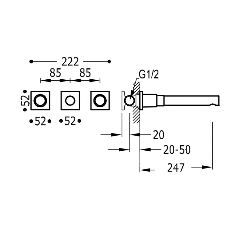Змішувач для раковини Tres Project-Tres настінний двовентильний вилив 247 мм хром 21175301