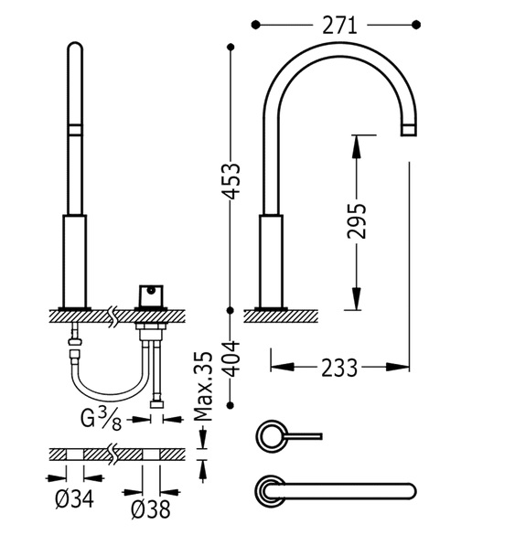 - Розмір врізного отвори: Ø 34 мм, Ø 38 мм