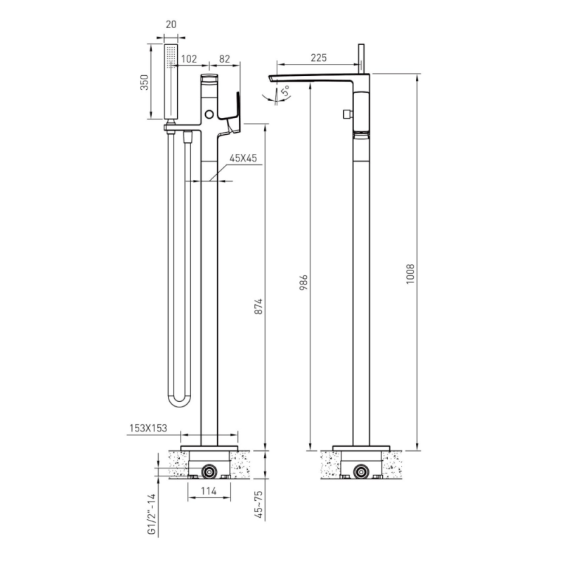 1) Змішувач для ванної Imprese Grafiky підлоговий з ручним душем хром