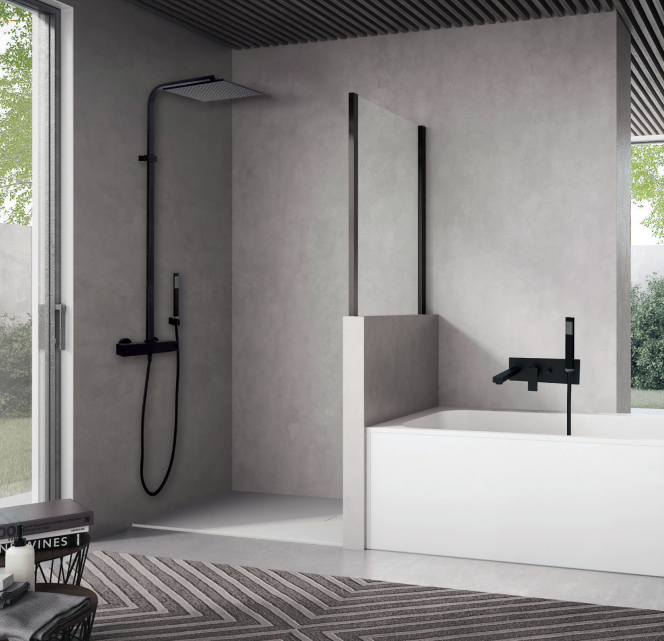 Прихований змішувач для ванни Paffoni Elle з прямокутною настінного панеллю, дивертор, виливши і ручний душ. У комплекті з внутрішньою частиною чорний матовий.