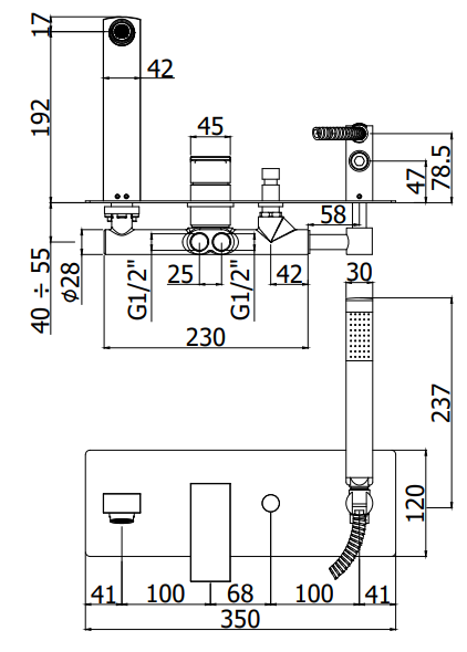 - Комплектація: настінна панель з нержавіючої сталі 350x120 мм, вилив з аератором M28x1, ручний душ і гнучкий шланг