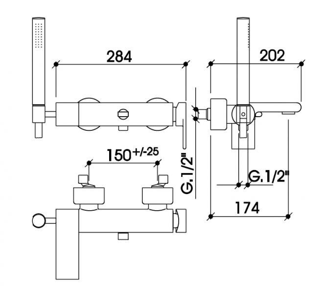 - Комплектність: змішувач для ванни, ручний душ, шланг, тримач ручногодуша