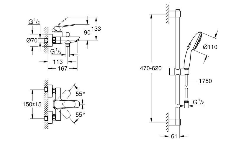 - регульований розсувний елемент (поворотний і розсувний тримач для душу)