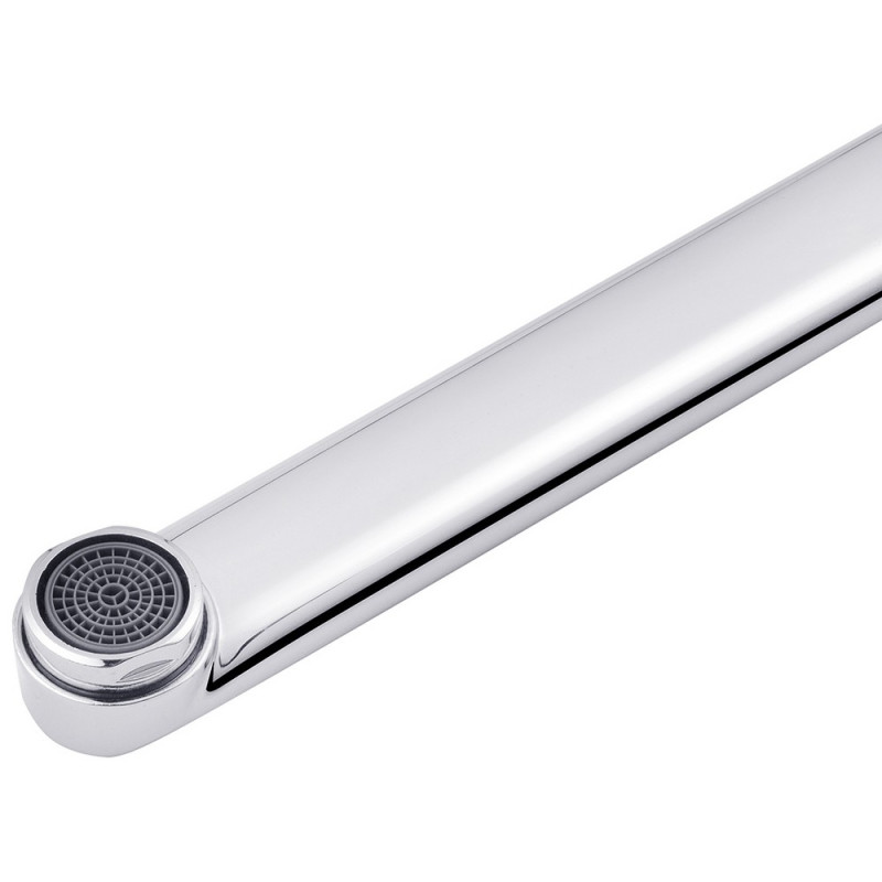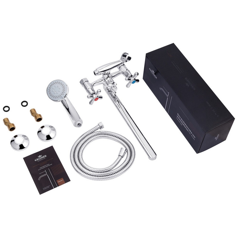 Змішувач для ванни Kroner KRP Royce - C072 з довгим поворотним виливом виготовлений з латуні, оснащений душовим шлангом і лійкою. Завдяки хромованому покриттюміцна поверхня і привабливий зовнішній вигляд. Є два крани для включення води. Для перемикання в душ - дивертер. Настінне кріплення здійснюється за допомогою кріпильних елементів, що входять в комплект. Декоративні розетки приховають всі дефекти монтажу в оздобленні ванної кімнати.