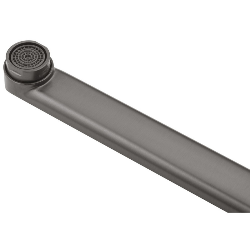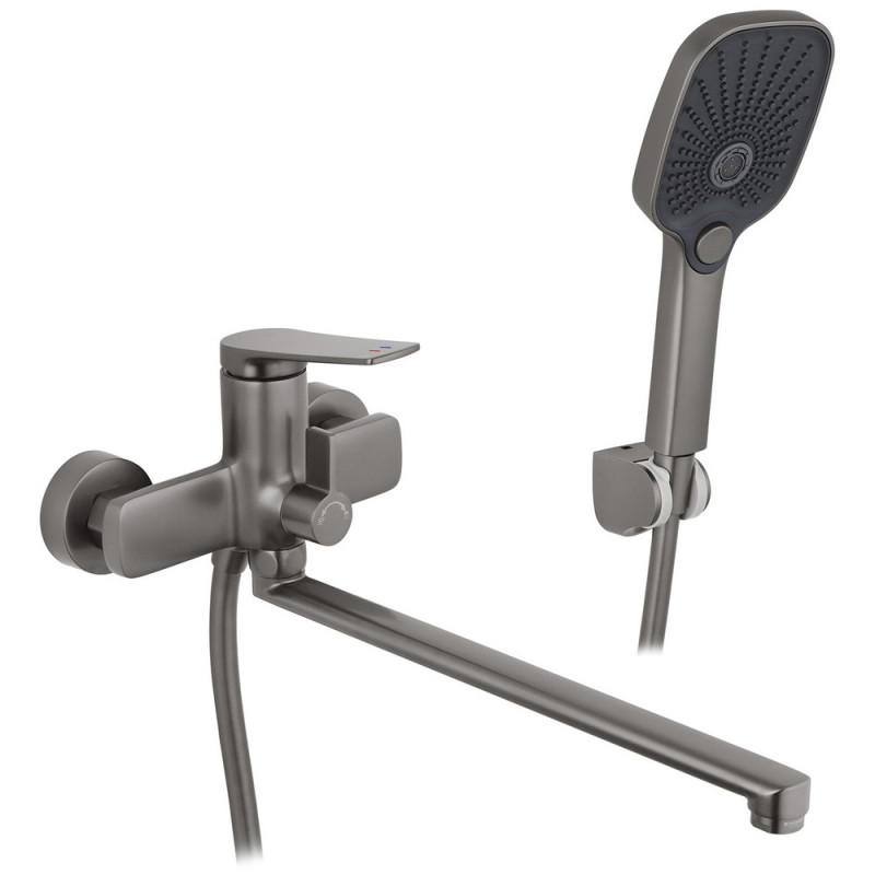 Змішувач виготовлений з міцної латуні, що гарантує довговічність і стійкість до корозії. Матова поверхня графітового кольору надає виробу сучасний і вишуканий вигляд, який ідеально впишеться в будь-який інтер'єр. Настінний спосіб кріплення забезпечує надійність монтажу та зручність використання.