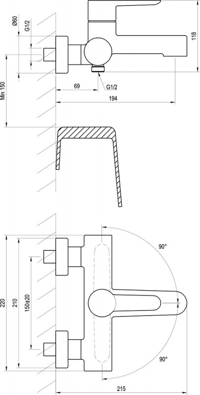 Змішувач для ванної Ravak Puri PU 022.20 настінний одноважільний чорний