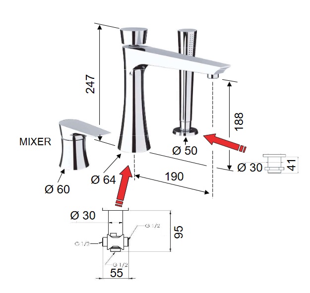 Змішувач на борт ванни Daniel Diva з ручним душем хром
