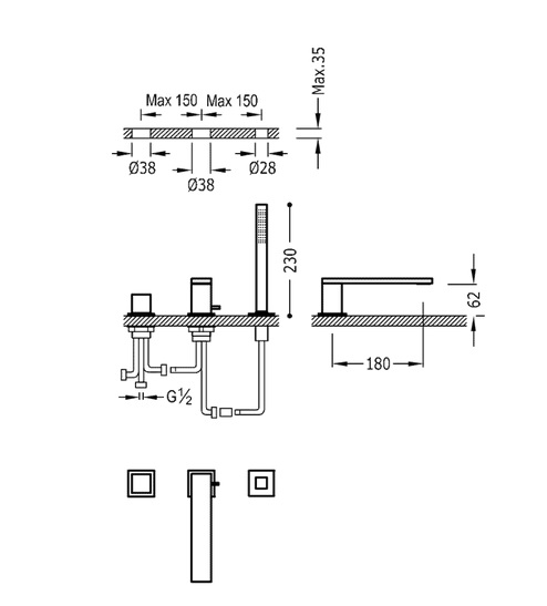 Змішувач на борт ванни Tres Cuadro-Tres з ручним душем хром 00616106