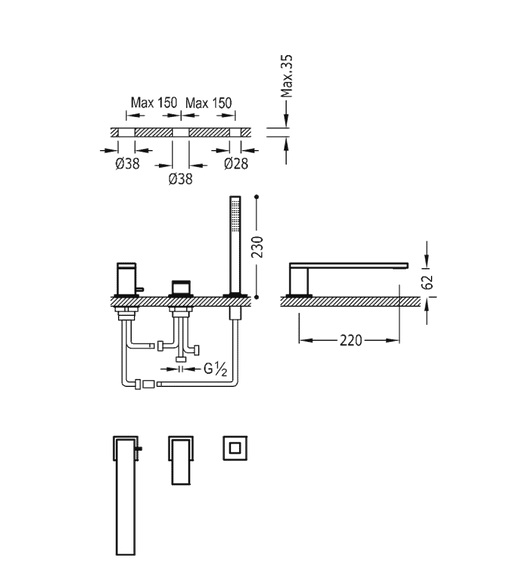 Змішувач на борт ванни Tres Cuadro-Tres з ручним душем хром 00616103