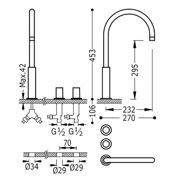 - Розмір врізного отвори: Ø 34 мм, Ø 29 мм