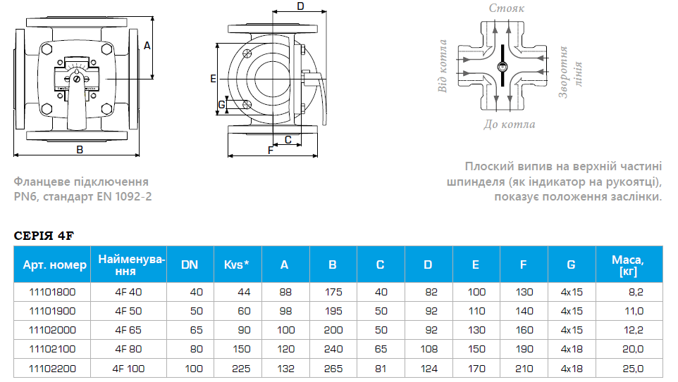 Серія 4F - це 4-ходові клапани зпідключенням до фланця PN6 для подвійного змішування аж до 6 бар. Клапани виготовлені з литого високопродуктивного чавуну, що дозволяє їх використання в системах опалення та охолодження. Серія 4F доступна у типорозмірах DN40-100. У комплект постачання входить фланець PN6 для фланцевої труби PN6. Клапан чудово комбінується з приводами та контролерами ESBE.