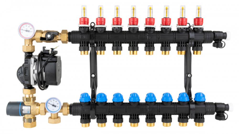 Змішувальний модуль забезпечує максимальну зручність та швидкість монтажу, точну та швидку температуру подачі теплоносія на теплу підлогу та тривалий термін експлуатації системи за рахунок надійності вузлів.