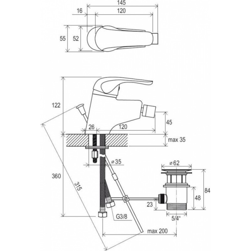 - розмір G3 / 8 зі стрижнем і донним клапаном підходить для біде Chrome, а також для будь-яких стандартних біде