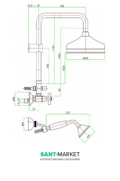 Змішувач для душа c переключать. стійкою 100 см лійкою 20 см і ручним душем Fiore MARGOT золото 26OO0620